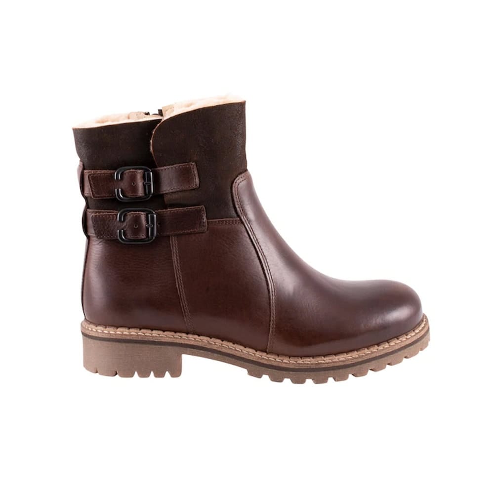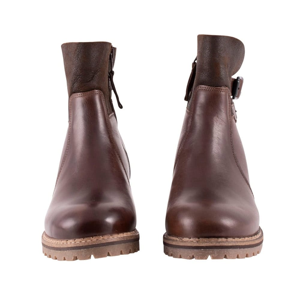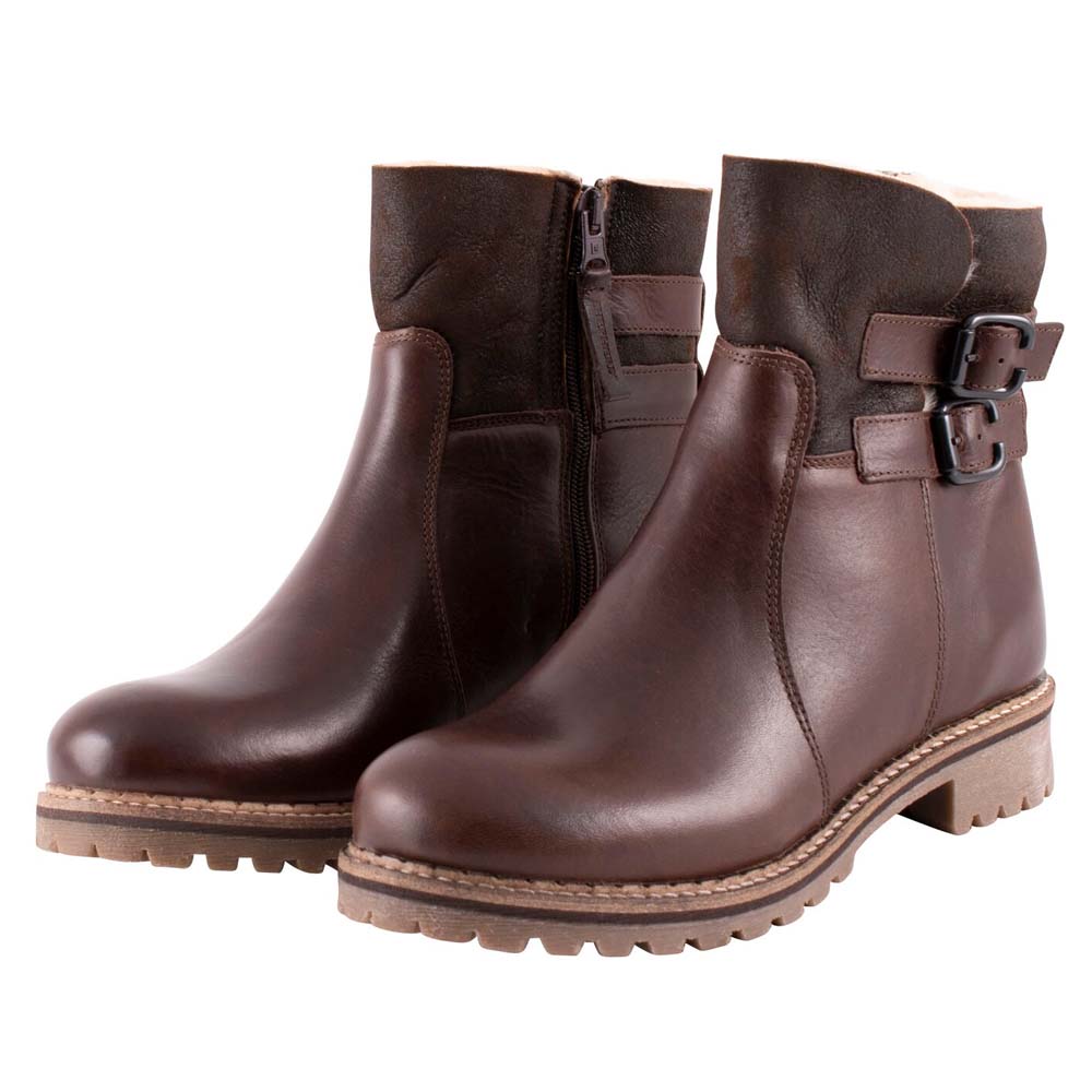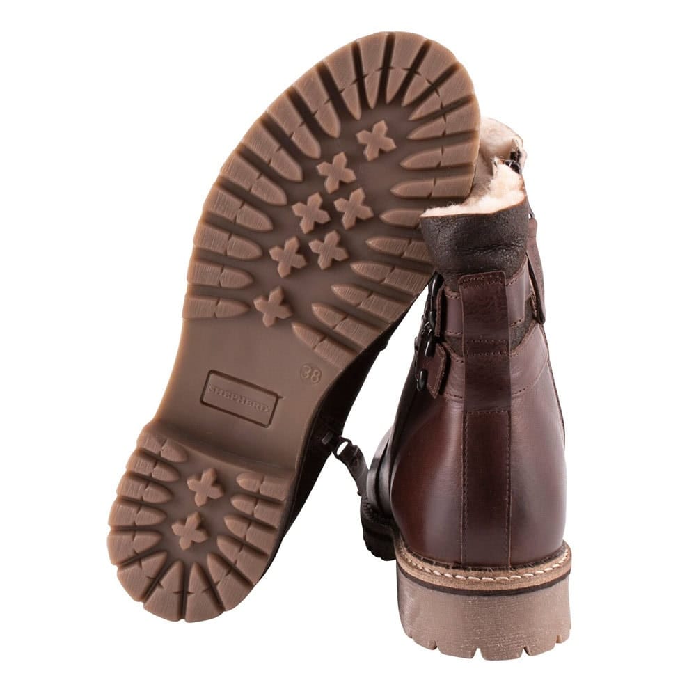 Shepherd Smilla är ett par ankelhöga läderstövlar med ett varmt och bekvämt fårskinn på insidan. Stövlarna har ett vikbart skaft med dubbla remmar på sidorna och en dragkedja på insidan. Yttersulan är robust och tillverkad av gummi. Skon har en klack på 3,5cm och ger dig utmärkt grepp. Dessa stövlar passar perfekt för dig som vill ha både stil och komfort under kalla vinterdagar. Det mjuka fårskinnet håller fötterna varma och bekväma, medan det läderövre materialet ger en elegant touch. Den robusta yttersulan gör det också möjligt att använda stövlarna på olika underlag.