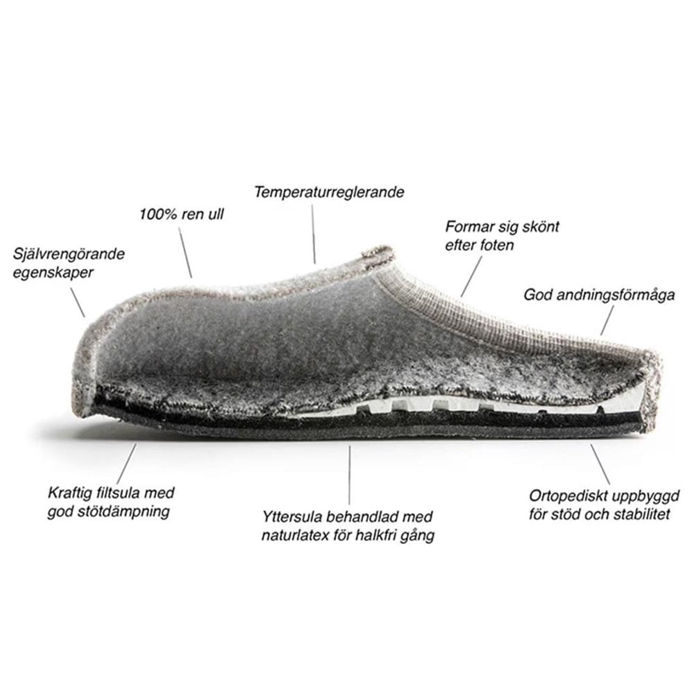 Ulle Stripe innetofflor är tillverkade av 100% ull vilket ger en varm och skön känsla. Den ergonomiskt uppbyggda sulan ger stöd och stötdämpning, medan det naturliga ullmaterialet andas och reglerar temperaturen, perfekt för året runt-bruk. Med anti-slip funktion är dessa tofflor idealiska för både vardagsbruk och avkopplande stunder. ULLE kan upplevas små i storleken – Vi rekomenderar att gå upp 1 storlek.