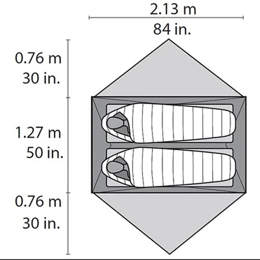 Sovkabinen i Hubba Hubba NX mäter 127 x 213 cm och ger två vuxna personer en behaglig sovyta. Den totala golvytan mäter 2,7 kvm och takhöjden på 1 meter gör det enkelt att sitta upprätt inne i tältet.